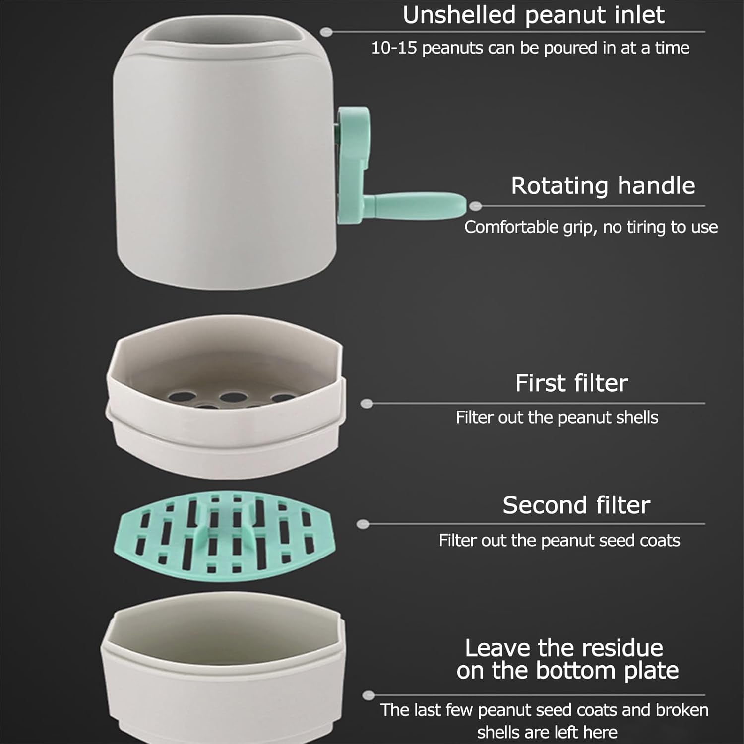 Efficient Shelling Mechanism: Internal grinding structure cracks shells and separates nuts cleanly